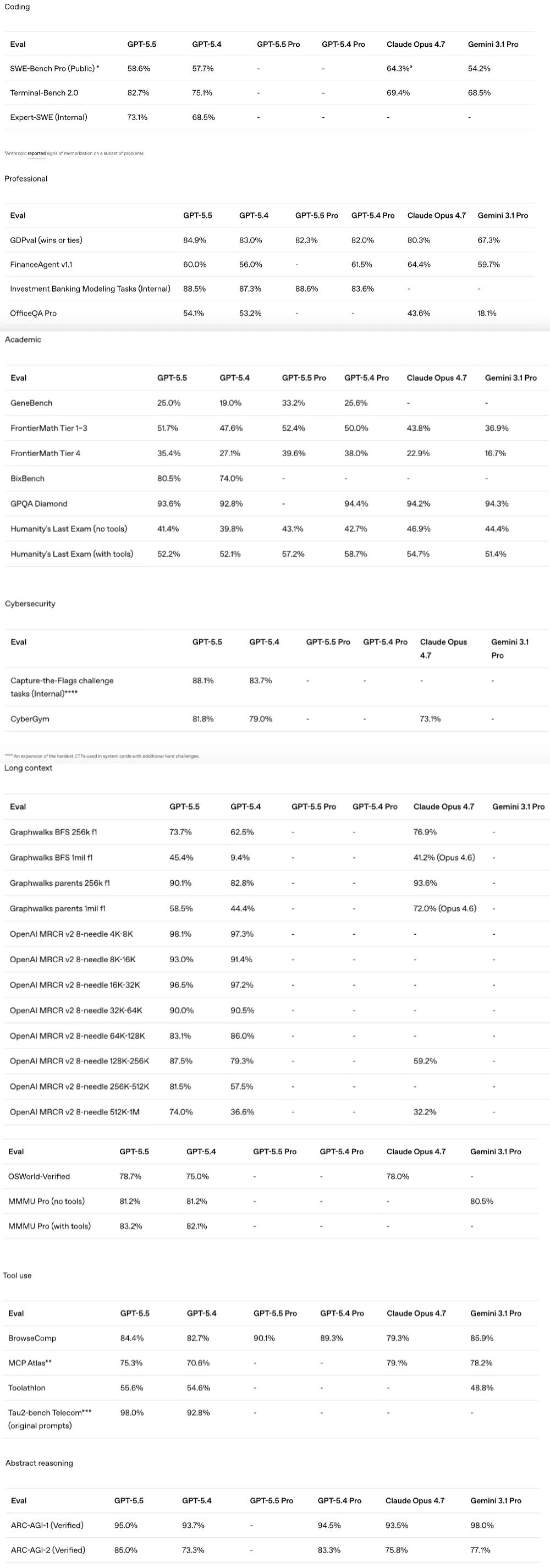 但在学术和工具使用能力上,GPT‑5.5与Claude Opus 4.7和Gemini 3.1 Pro并未拉出明显差距。