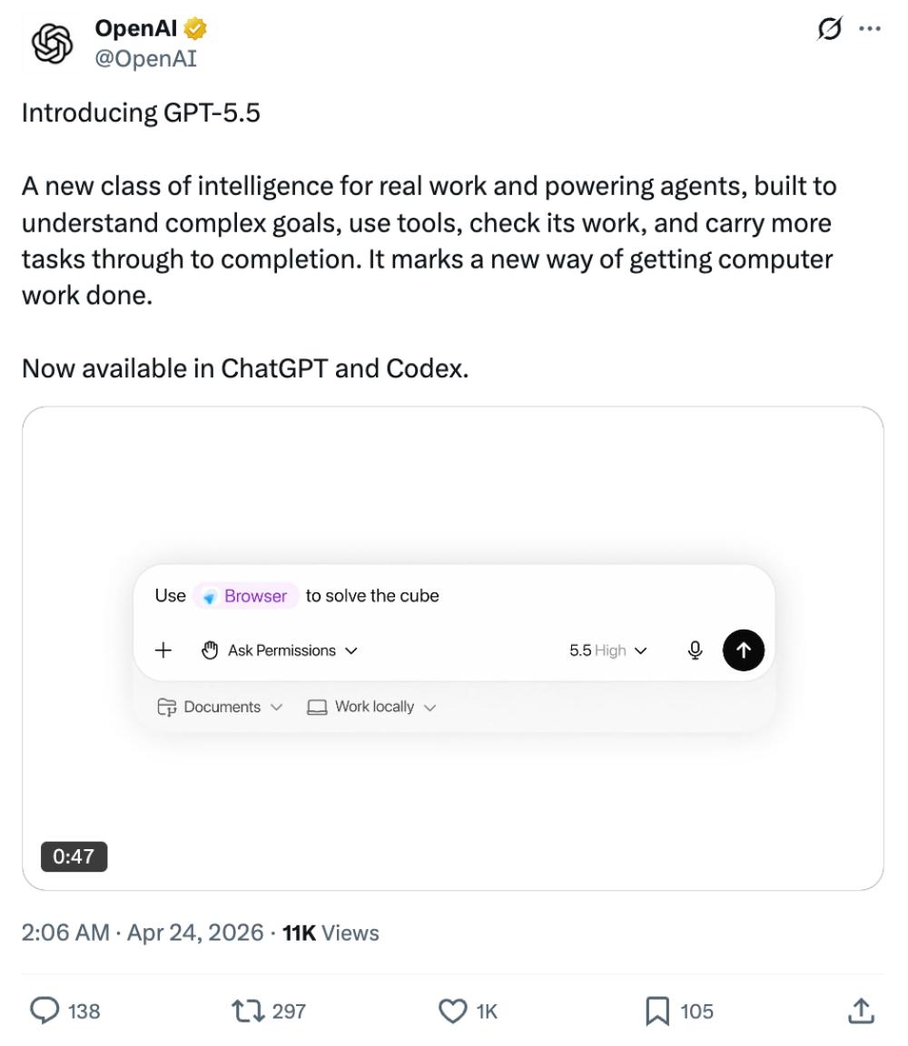 智东西4月24日报道,今天凌晨,OpenAI智能体编程模型GPT‑5.5正式发布!