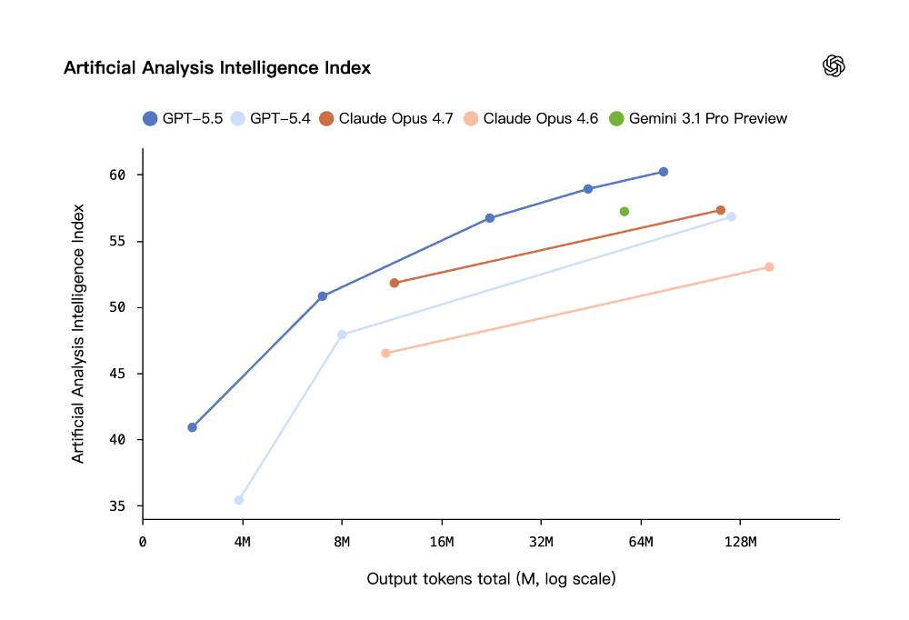 根据Artificial Analysis的智能指数,GPT‑5.5在成绩最高的同时,其成本仅为同类前沿编码模型的一半。