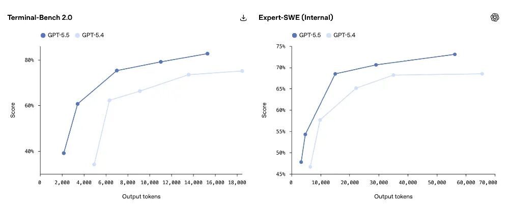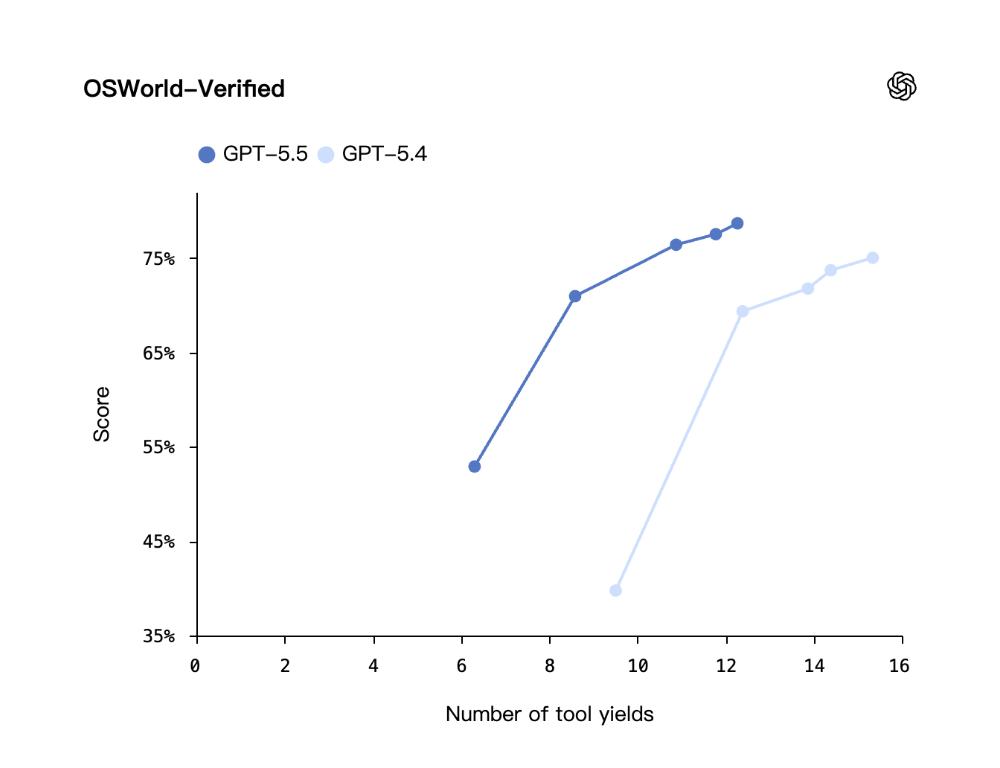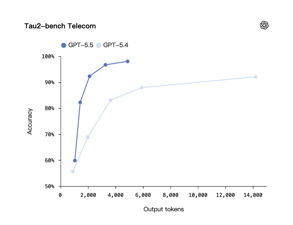 在所有这三项评估中,GPT‑5.5在比GPT‑5.4使用更少token的同时,得分均有提升。