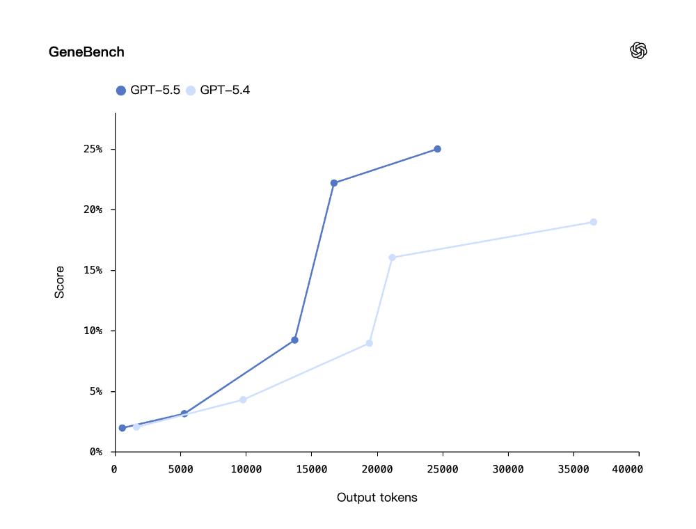 GeneBench是一个专注于遗传学和定量生物学中多阶段科学数据分析的新评估基准,GPT‑5.5相较于GPT‑5.4表现出明显的提升。