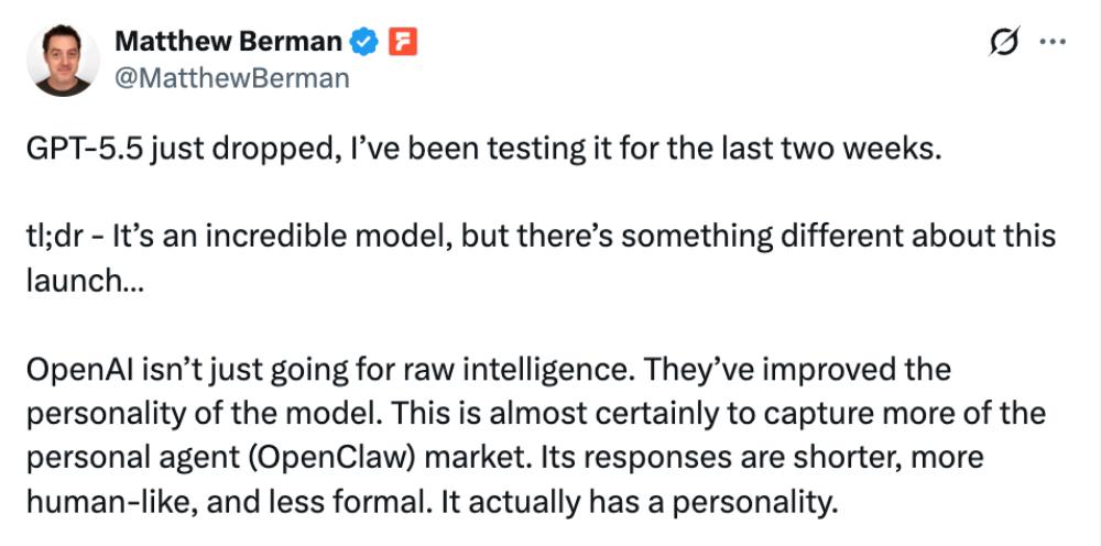 知名AI测评网红Matthew Berman称其最近两周都在测试GPT-5.5,他感受到OpenAI改进了模型的个性,他认为这是为了抢占更多个人智能体(如OpenClaw)市场。“它的回答更简洁、更像真人、不那么正式。它确实有了自己的个性。”