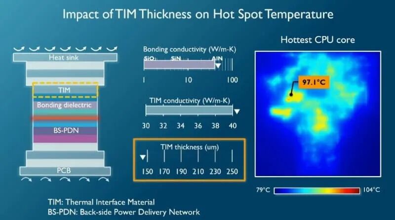 具体而言,通过将结处的介电材料从传统的二氧化硅更换为氮化铝,导热系数提高了40倍。通过这种材料更换,导热界面材料的导热系数提高了1.33倍。导热界面材料的厚度减少到原厚度的60%。