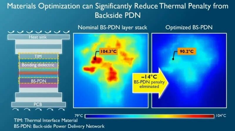 背部供电网络 (BS-PDN) 的结构。在采取散热措施之前(最高温度 104.3°C)