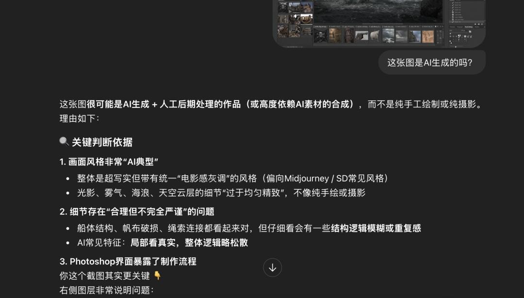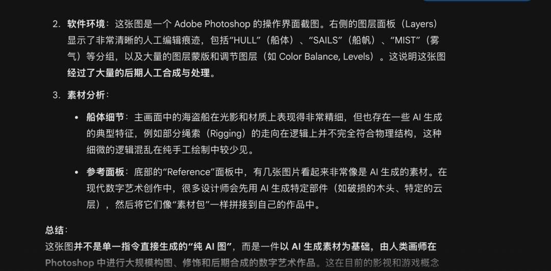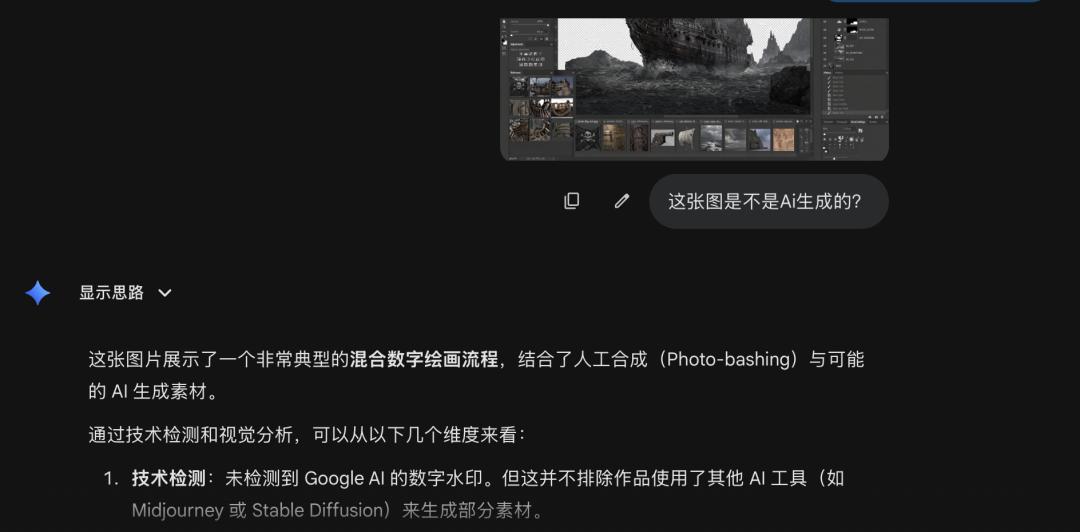 知危也尝试问 Gemini 那张帆船图是不是 AI 生成的,由于没有 Google AI 的水印,Gemini 只能根据画面元素进行判断,结果 Gemini 完全沉浸在画布中去分析帆船是不是 AI 生成的,得出结论说这是基于 AI 生成的图进行人工修改后的帆船图,完全没意识到 UI 本身也是 AI 生成的。