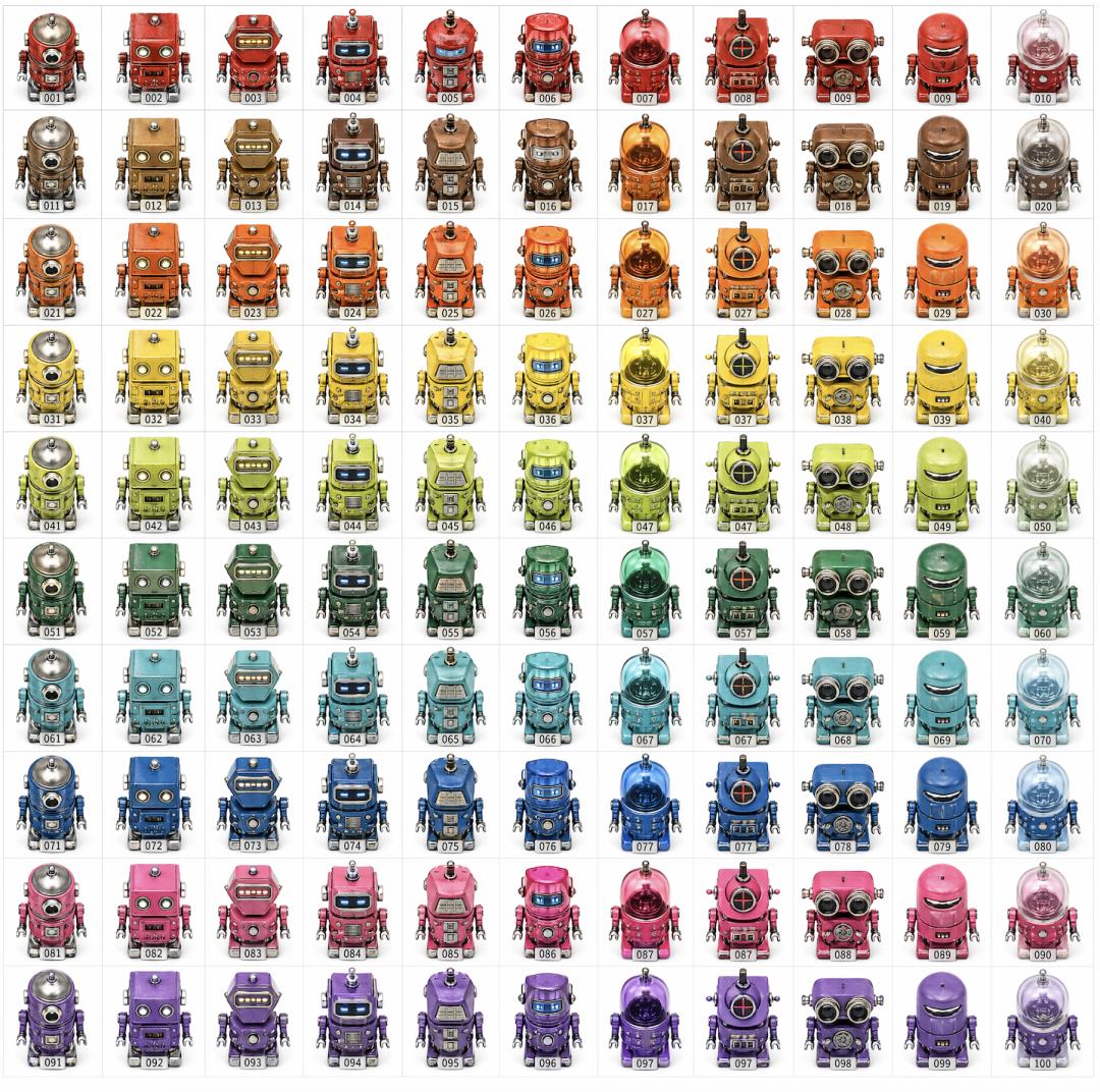 每个机器人 = 唯一组合(颜色 × 材质 × 头 × 眼)