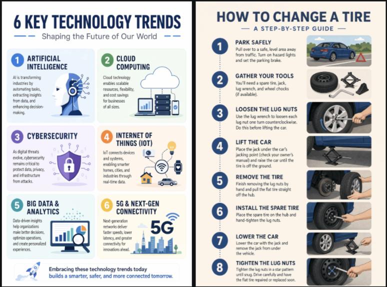 最后我们直接将文字篇幅提升到万字规模,模型直接傻了,输出了一个换胎的科普图,还有一个前沿信息技术的 PPT,不知道受了什么刺激。实际上我输入的内容是知危之前的采访文章全篇,不知道模型是怎么联想到换胎的。