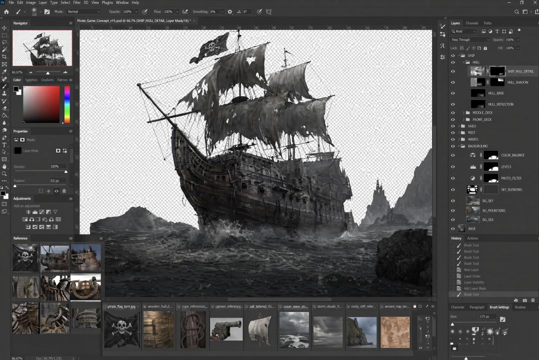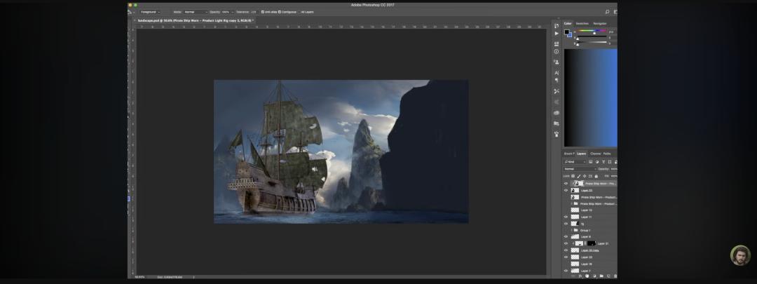 再看一个游戏概念设计场景,作业内容是正在将海盗帆船主体和大海背景进行融合,是 PS 中比较复杂的操作。
