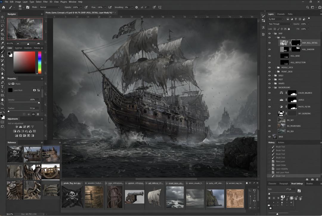 屏幕上显示着一块巨大的横向画布,中心位置正在合成一幅精美的海盗帆船概念图。船体由多张图片拼接而成,包括木质船体、破旧的白色船帆、绳索、桅杆、大炮、金属铆钉、海浪飞溅的浪花以及浓雾和暴风云,所有元素同时呈现。图像仍处于未完成的编辑状态,显然是在进行后期修饰,而非最终成品展示。