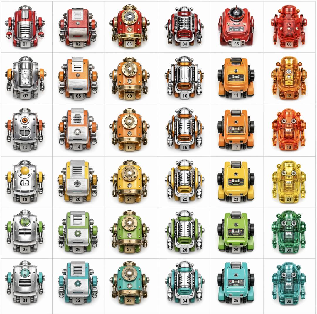 整体风格:复古机械玩具(nostalgic retro toy robots),强调齿轮结构、铆钉连接、机械拼接感;造型统一基础结构(头+躯干+四肢),但细节变化极丰富。色彩高饱和但真实材质响应准确。