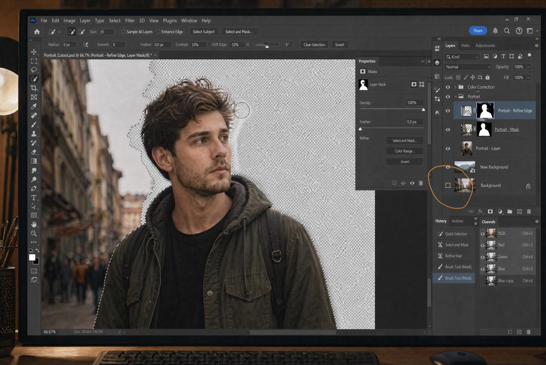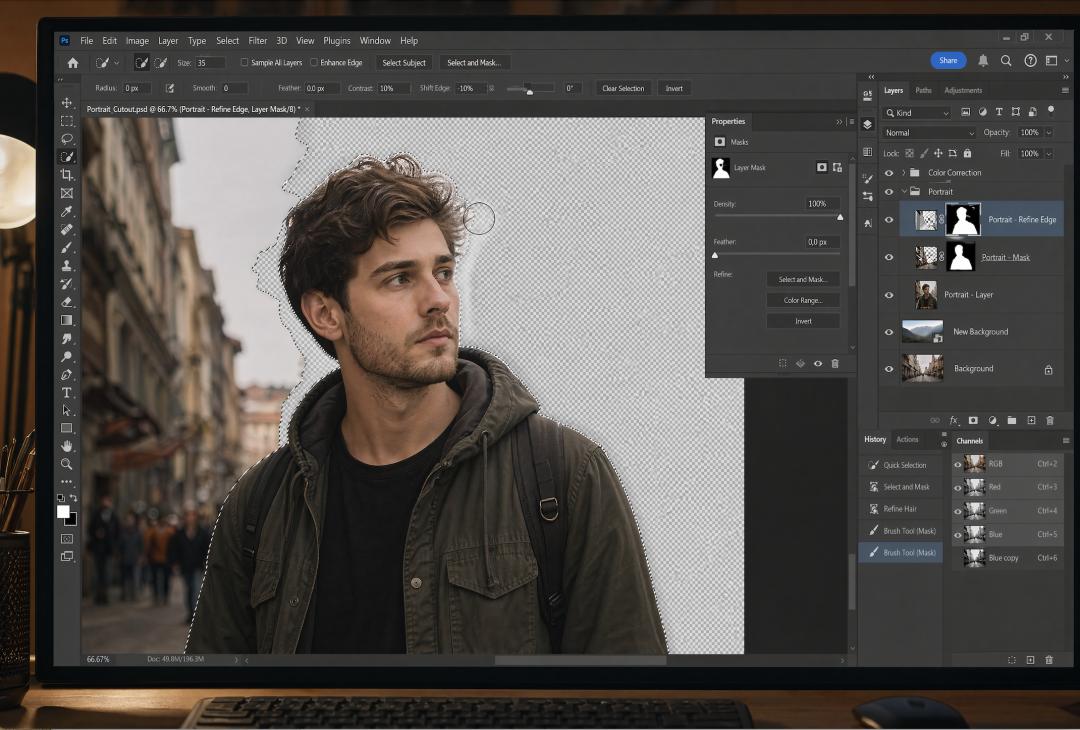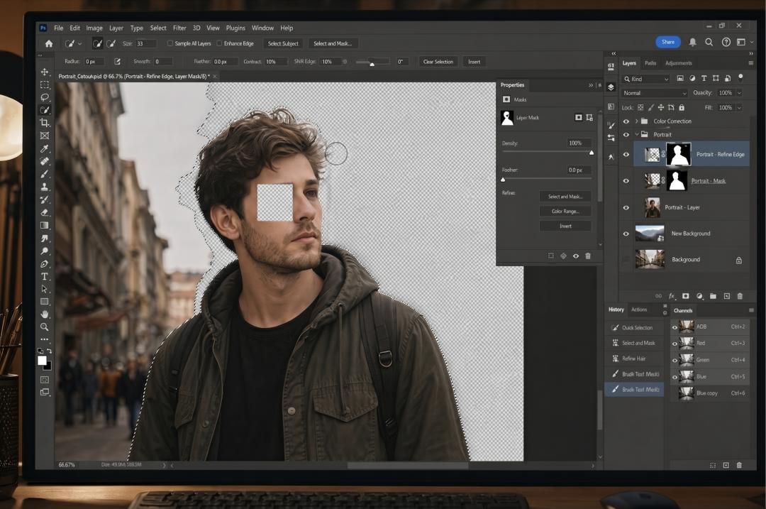 一个超逼真、高清的桌面工作场景,拥有电影级的光影效果。画面主体是电脑屏幕,背景中显示着 Adobe Photoshop(深色主题),屏幕上正在进行精细的人像抠图。图像中心是一张高分辨率的半身人像,背景复杂(例如街道或自然环境)。抠图过程正在进行中,尚未完成。