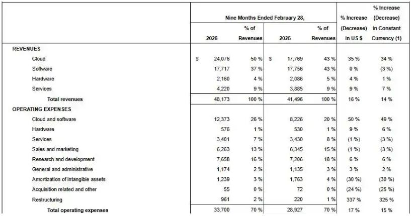 根据甲骨文于3月11日发布的财报数据,2026财年第三财季(截至2026年2月28日),甲骨文实现总营收171.90亿美元,同比增长22%,高于市场预期的169.1亿美元;净利润为37.21亿美元,同比增长26.5%,这也是甲骨文十五年来首次实现营收和调整后盈利增速同时超过20%的季度。