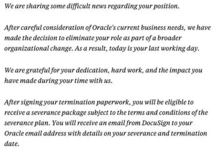 长期以来,甲骨文公司以其工作稳定、节奏慢、不加班、福利好等特点,被广泛称为硅谷“养老厂”。然而,此次全球大裁员彻底打破了这一印象。据悉,甲骨文官方对此次裁员的解释十分简略,仅在通知中写道:“经过对当前业务需求的慎重考虑,我们决定撤销您的职位,这是公司更广泛的组织架构调整的一部分。因此,今天将是您的最后工作日。”