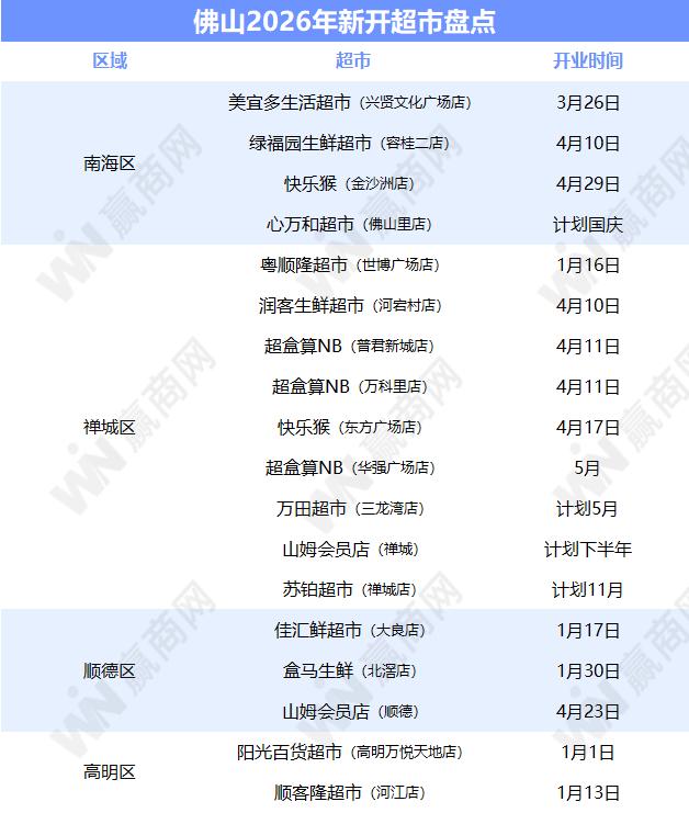 据赢商大数据统计,今年将有10个购物中心筹备开业,新增商业体量111.3万㎡,不少新项目带动新超市在佛山市场亮相。(相关阅读:万象天地、金铂中心、山姆…2026佛山商业大年来了!)