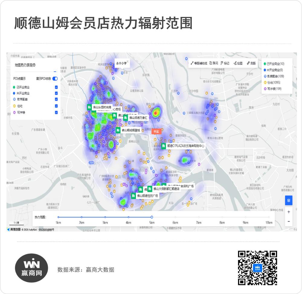 透过赢商大数据城市商业地图可以看到,山姆会员店在顺德5公里范围内辐射1095个住宅小区,且周边集结顺德万象汇、顺德欢乐海岸PLUS等优质商业项目,能产生很强的商业协同效应和辐射影响力。