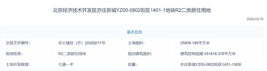北京方面,有1宗亦庄新城宅地出让,土地出让面积2.59万平方米,规划建筑面积5.18万平方米,容积率2,建筑限高60米,起始价12.18亿元,起始楼面价2.35万元/平方米。