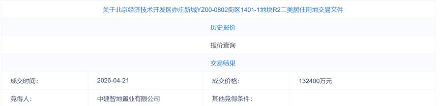 同日,北京1宗亦庄新城宅地出让,吸引了5家房企现场参与竞价,最终以总价13.24亿元、溢价率8.7%成交,成交楼面价约2.56万元/平方米。
