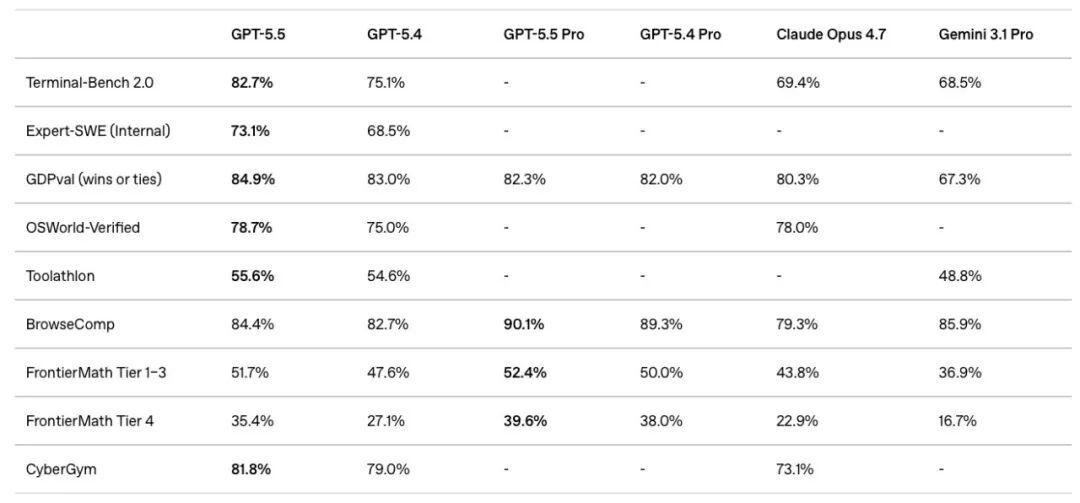 在测试复杂命令行工作流的Terminal-Bench 2.0中,GPT-5.5得分82.7%,Claude Opus 4.7的69.4%超过13个百分点;在测试AI独立操作真实电脑的OSWorld-Verified中,成功率78.7%,超越人类基线;在测试跨44种职业知识工作的GDPval中,84.9%的任务达到或超过行业专家水平。
