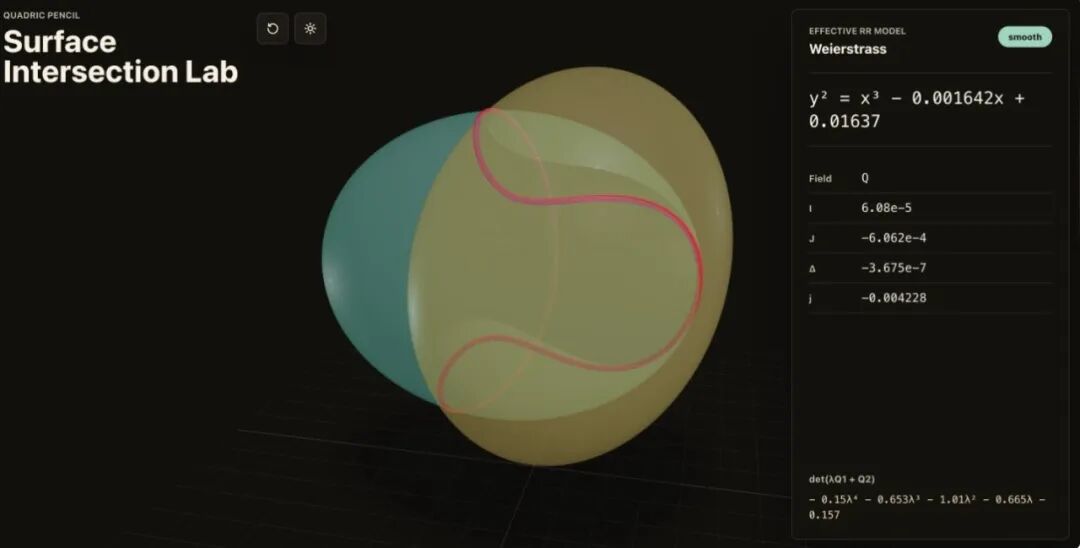 配图:Bartosz Naskręcki教授构建的代数几何应用截图——二次曲面相交可视化与魏尔斯特拉斯方程实时计算界面