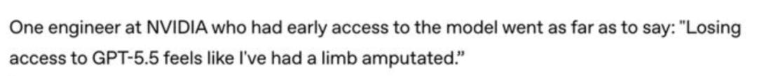 一位英伟达工程师的评价更直白:"失去GPT-5.5的访问权限,感觉就像截肢"。
