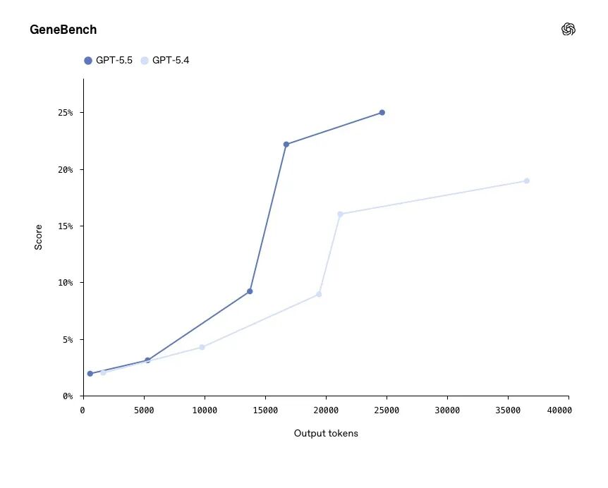在GeneBench上(遗传学和定量生物学多阶段数据分析评测),GPT-5.5得分25.0%,GPT-5.4为19.0%。这些任务通常对应科学专家数天的工作量,模型需要在几乎没有监督的情况下推理可能存在错误的数据、应对隐藏的混杂因素,并正确实施现代统计方法。