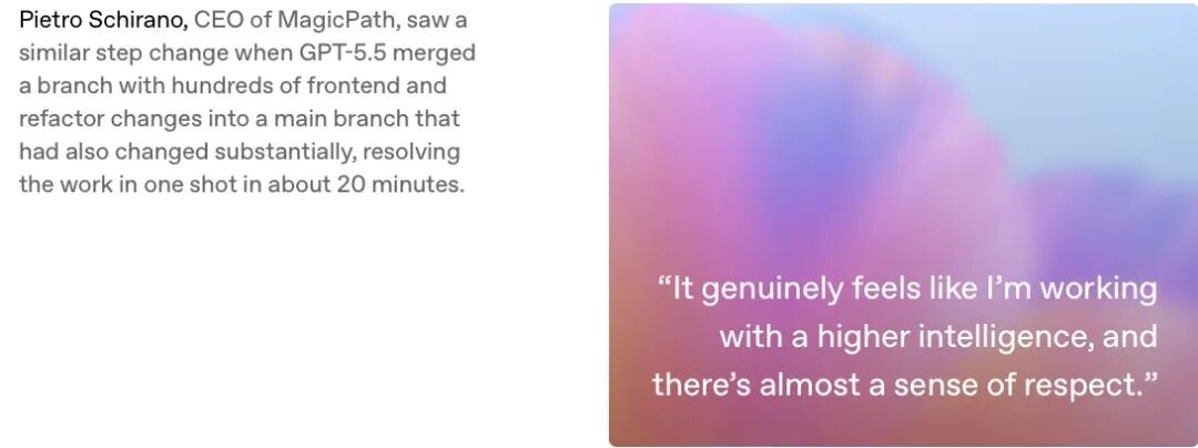 对于使用反馈方面。Every创始人兼 CEO Dan Shipper 讲了一段经历:他之前遇到过一个上线后的 bug,自己调了好几天没搞定,最后只能请公司最强的工程师出手,重写了一部分系统。GPT-5.5 出来后,他做了个实验——把模型放回 bug 还没修的那个状态,看它能不能自己得出和工程师一样的方案。GPT-5.4 做不到,GPT-5.5 做到了。他评价:"这是我用过的第一个真正具备概念清晰度的编程模型"。