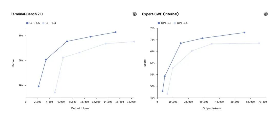从图表曲线可以看出,随着输出Token数量的增加,GPT-5.5的得分提升幅度始终领先于GPT-5.4,且在约15,000Token处出现明显拉开——这意味着面对需要深度推理的长任务,GPT-5.5的优势会随任务复杂度的提升而进一步放大。
