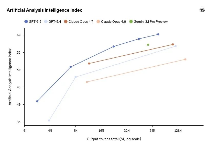 从Artificial Analysis智能指数图可以直观看出这一点:横轴是输出Token总量(对数刻度),纵轴是综合智能得分。GPT-5.5的曲线不仅在得分上全面领先GPT-5.4、Claude Opus 4.7和Gemini 3.1 Pro Preview,更关键的是,它在Token消耗较少的区间就已经达到其他模型需要消耗更多Token才能达到的得分水平——更强的能力,更低的成本,这正是“效率提升”的直观体现。