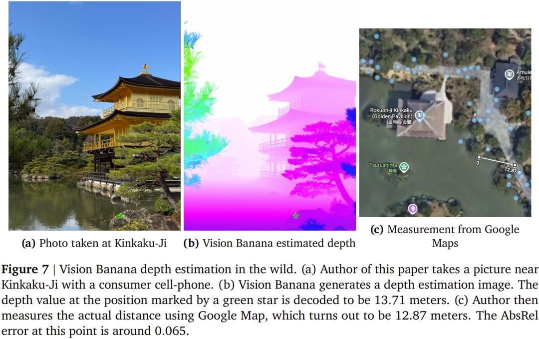 研究者还做了一个颇具说服力的 vibe test:论文作者本人在鹿苑寺附近用普通智能手机拍摄了一张照片,Vision Banana 估计出照片中标注点的深度为 13.71 米,实际用谷歌地图测量的距离为 12.87 米,绝对相对误差仅约 0.065。