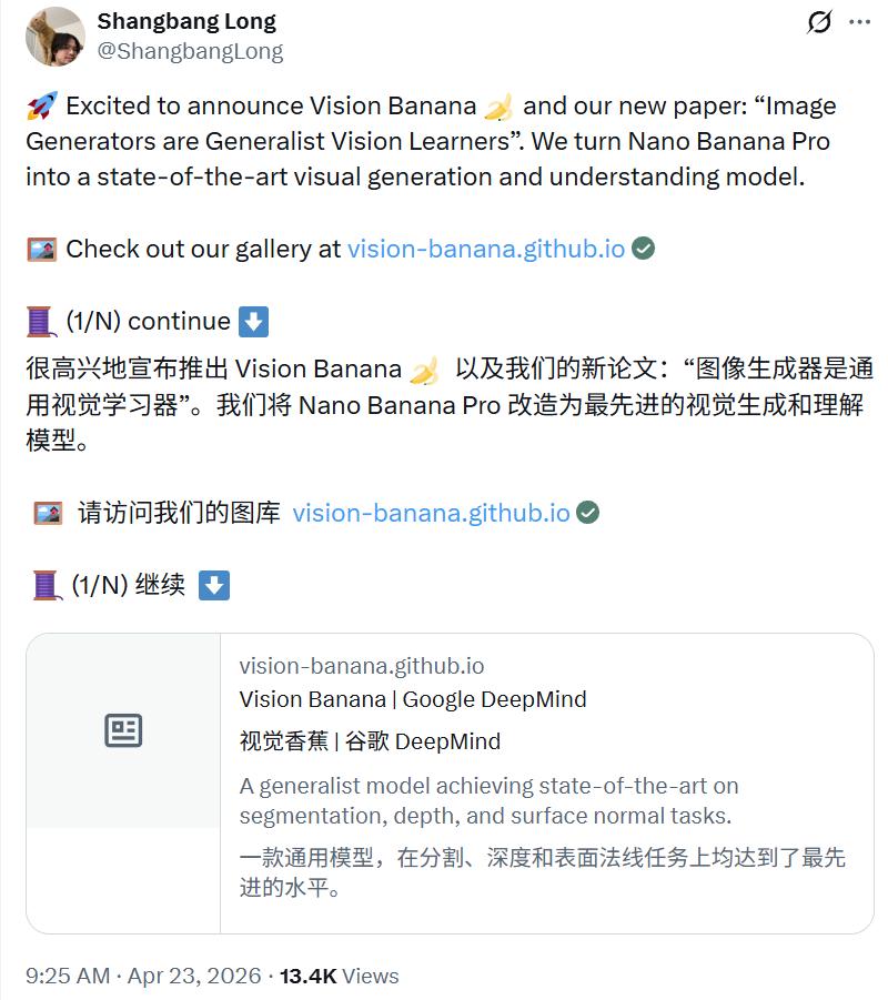 该论文提出的Vision Banana,基座就是那个名为 Nano Banana Pro (NBP) 的图像生成模型。