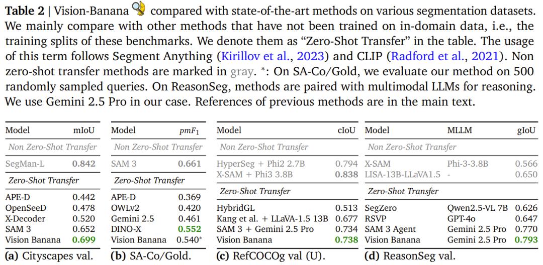 语义分割方面,Vision Banana 在 Cityscapes 数据集(19 类城市场景)上以 mIoU 0.699 超越 SAM 3 的 0.652,领跑所有零样本迁移方法,进一步缩小了与闭集专有模型(如 SegMan-L)之间的差距。