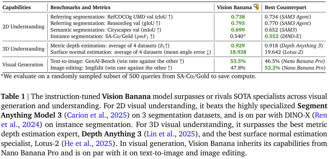通过这种用画图来做题的方法,一个统一的 Vision Banana 模型在 2D 和 3D 视觉理解任务上,打败或逼平了一众目前顶尖的各类专业模型: