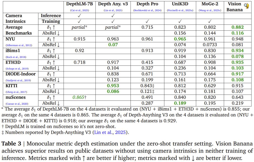 在六大公开基准上,Vision Banana 的平均 δ_1 精度达到 0.882,在与 Depth Anything V3 直接可比的四个数据集(NYU、ETH3D、DIODE-indoor、KITTI)上平均 δ_1 为 0.929,超过 Depth Anything V3 的 0.918。与 UniK3D 相比领先近 6 个百分点,绝对相对误差(AbsRel)比 MoGe-2 低约 20%。