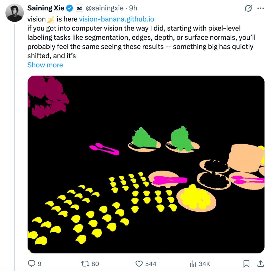 这篇论文由多位核心作者和贡献者共同完成,另外,我们还能看到谢赛宁和何恺明等熟悉的名字。谢赛宁连发数推,强调了通用模型的崛起与超越:像 Vision Banana 这样的单一多模态通用模型,在图像分割、边缘检测等底层感知任务上首次击败了 SAM3 和 DepthAnything3 等顶尖的领域专用模型。以往被视为不同问题的感知任务,现在都可以通过简单的提示词在统一的系统下完成。