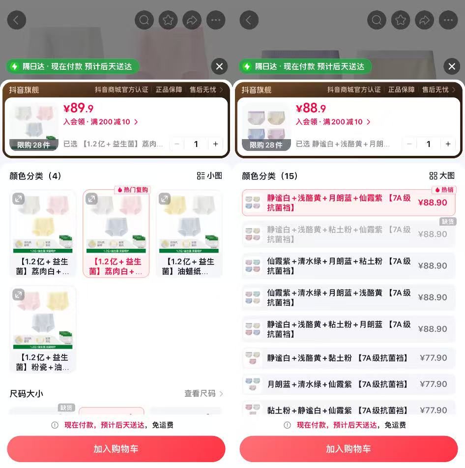 都市丽人旗舰店内“10A级益生菌纯棉内裤2026款”售价41.7元/3条,“10A纯棉抗菌内裤2026款”则是41.24元/4条,每条益生菌内裤价格比普通抗菌纯棉内裤贵3.6元。