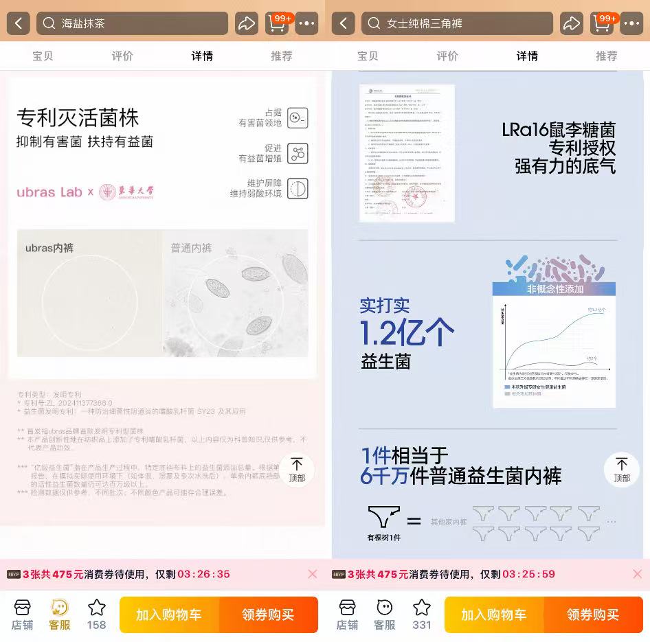 有棵树旗舰店内益生菌内裤(左)对比普通抗菌内裤(右)