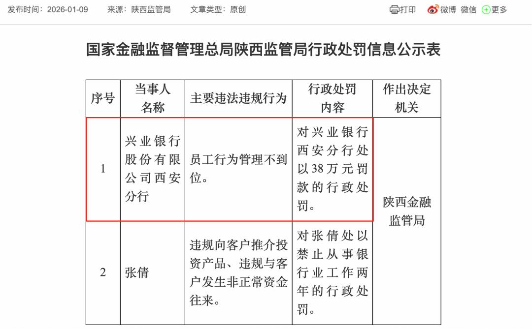 今年1月9日,新年才过9天,兴业银行西安分行就因为“员工行为管理不到位”被罚38万元,原因很直接:员工违规向客户推介投资产品、违规与客户发生非正常资金往来。