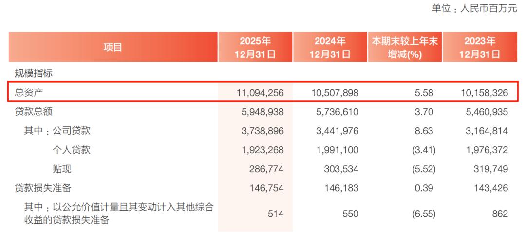 2025年,兴业银行总资产11.09万亿,同比增长5.58%,存款、贷款也都有增长。