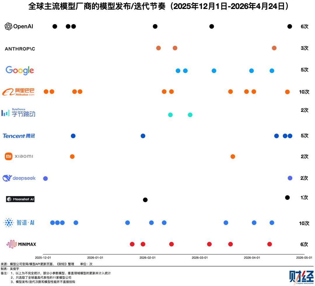 据《财经》不完全统计,2025年12月1日-2026年4月24日,美国市场(OpenAI、Anthropic、谷歌Gemini)和中国(包括阿里千问、字节跳动豆包、腾讯混元、小米MiMo、DeepSeek、月之暗面、智谱、MiniMax)的11家主流模型公司,在144天内至少发布或迭代了53款模型,几乎每2.7天就会有一款模型发布或迭代。