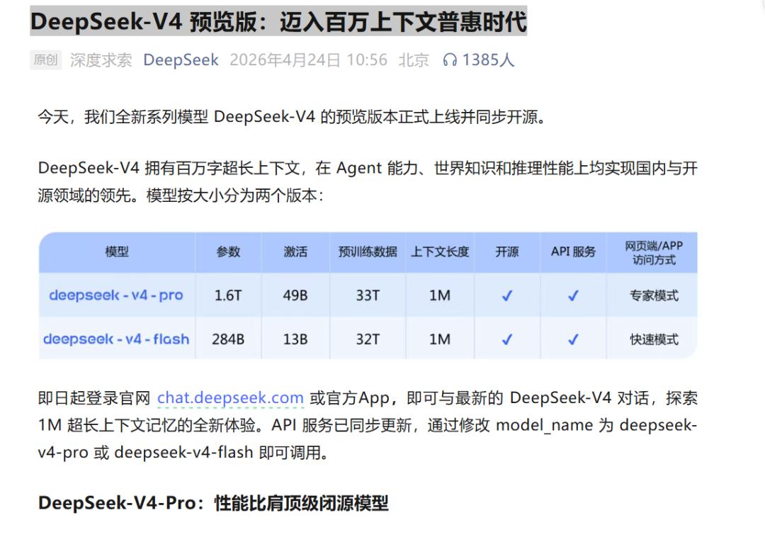 临近4月24日中午,DeepSeek官方公众号发布公告:《DeepSeek-V4 预览版:迈入百万上下文普惠时代》。被催更已久的V4终是来了、