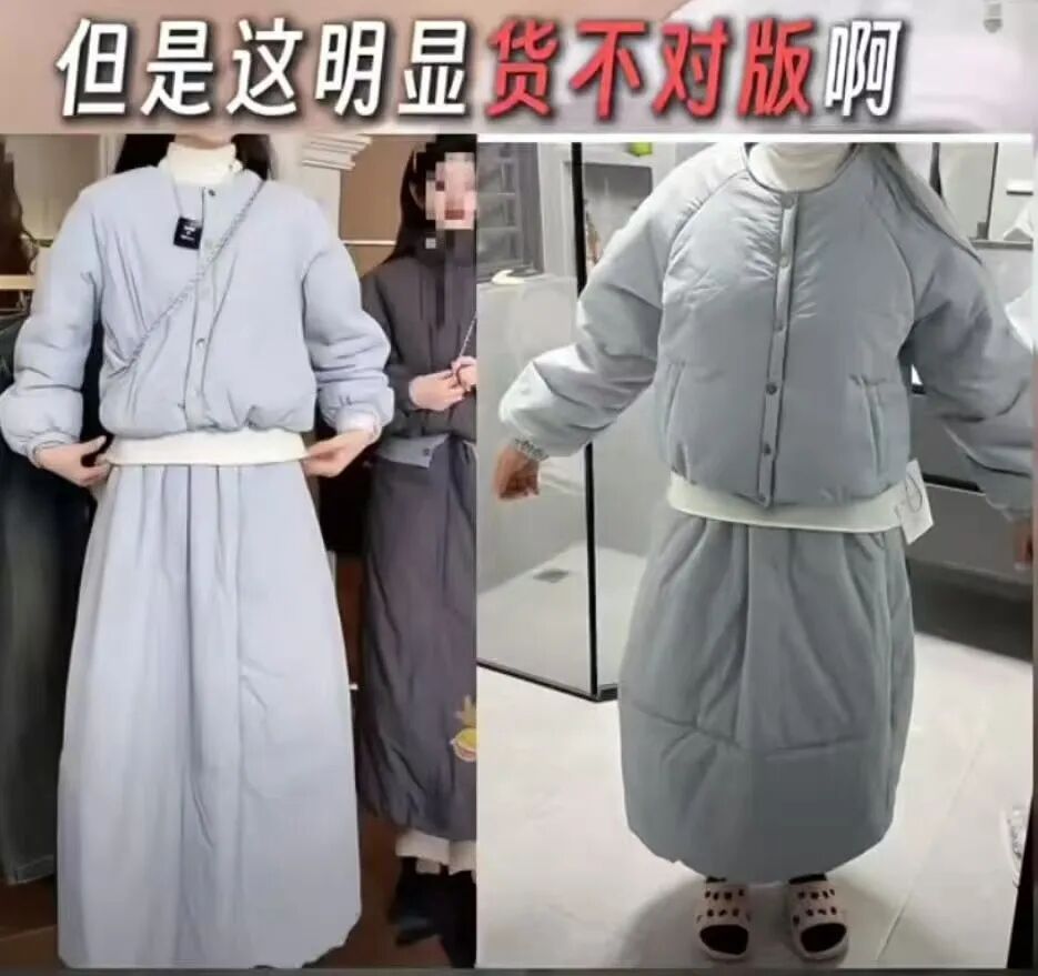 在偏远老家下单的同一件衣服,不仅薄得像纸片,填充物差了十万八千里,连产品名称都莫名其妙地从羊绒大衣变成了毛呢大衣。