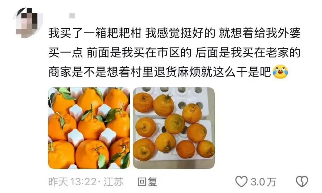 县城乃至农村消费者,收到的却是大小不一,甚至已经开始变质腐烂的歪瓜裂枣。