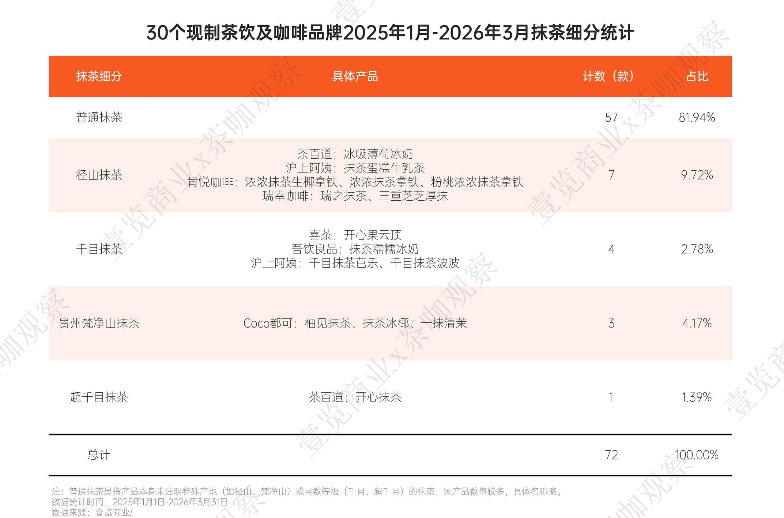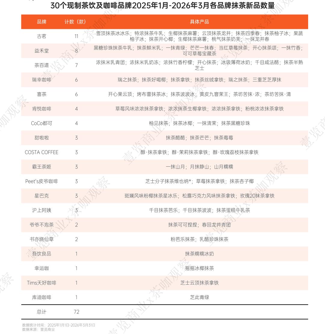 壹览商业统计,2025年1月至2026年3月,30个主流现制茶咖品牌共推出72款含抹茶元素的新品,从月度分布看,2026年3月单月上新18款,创下历史峰值。春秋两季构成两大推新高峰,显示出抹茶与季节更替、消费场景的强绑定关系。