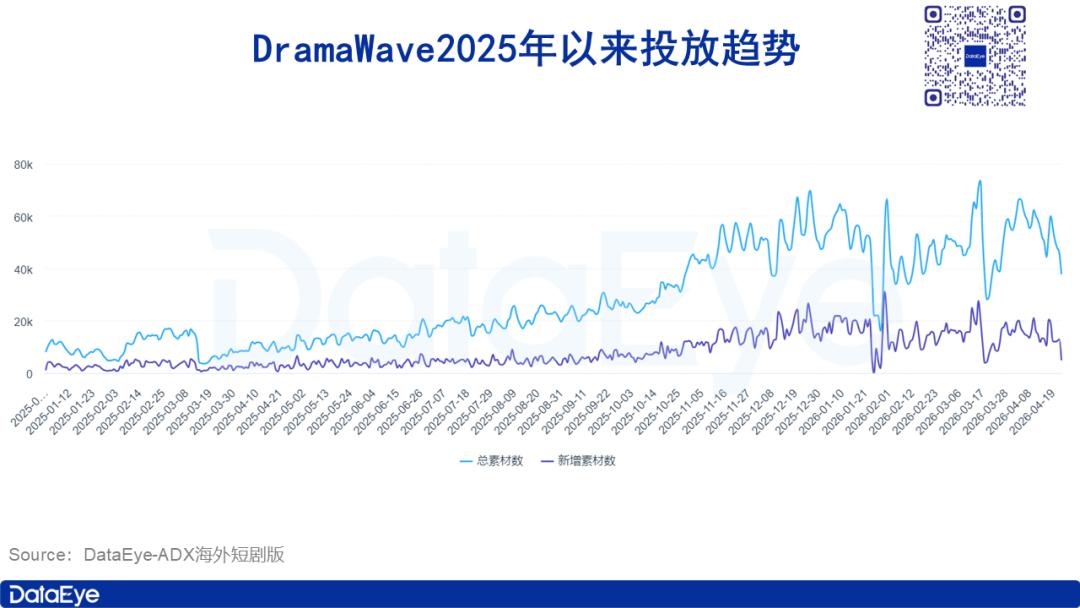 2025年上半年,DramaWave日均投放素材1.5-2万组,下半年提升至4万组以上,流量投放高峰期日均投放接近7万组。进入2026年,平台日均投放稳定在4万组以上,投放力度维持高位。
