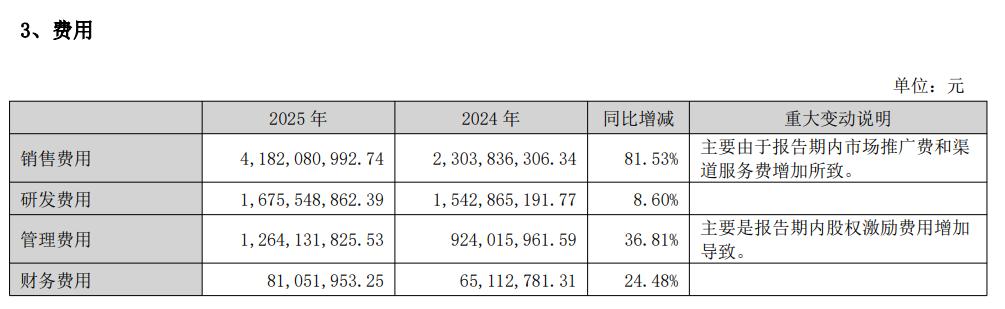 虽然收入保持增长,但昆仑万维已经连续两年亏损。公司持续亏损的核心原因,在于阶段性高额投入带来的费用压力:2025年销售费用同比激增81.53%,达到41.82亿元,主要系短剧、AI短剧平台及各类AI新产品加大流量投放、市场推广所致;研发费用16.76亿元,同比增长8.60%,主要由于公司持续加码AGI、AIGC、AI短剧等核心赛道技术研发。