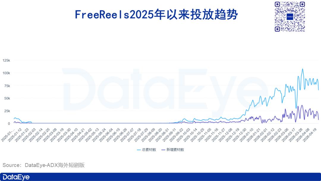 投放端来看,根据DataEye-ADX海外版数据,2025年FreeReels全年投放素材量15万组,位列海外短剧APP年度第十。
