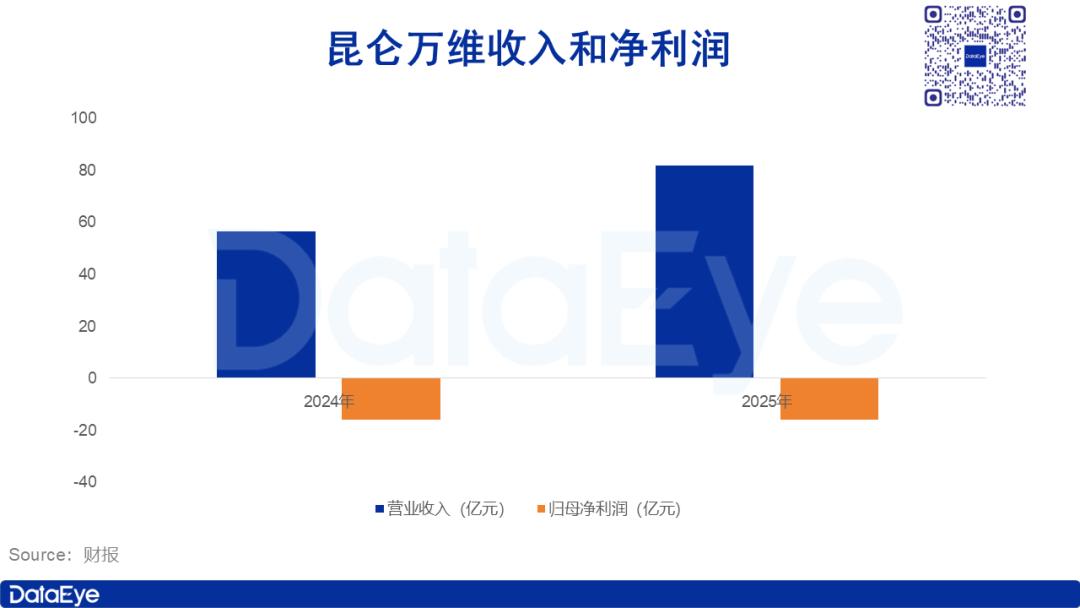 2025年昆仑万维实现营业总收入81.98亿元,同比增长44.78%,营收激增的核心动力来自AI相关业务的爆发式增长;全年净亏损15.93亿元,亏损同比微降0.13%,这也是公司连续第二年出现年度亏损。