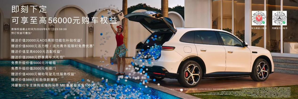 问界M6现已正式上市,即将亮相2026北京国际车展,欢迎莅临中国国际展览中心(顺义馆)E2馆E201问界展台近距离体验。目前全国门店已开启试驾,诚邀用户到店亲身体验新锐智慧SUV——问界M6,解锁属于年轻一代的智慧出行新体验。