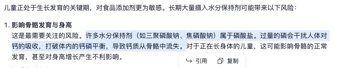 举个简单的例子,针对今年3·15食品安全板块提及的“食品保水剂”滥用提问,参考了百科词条的AI明确指出长期大量摄入磷酸盐(保水剂主要成分),可能导致儿童发育迟缓和骨骼畸形,并根据百科中的内容进一步说明了原因。