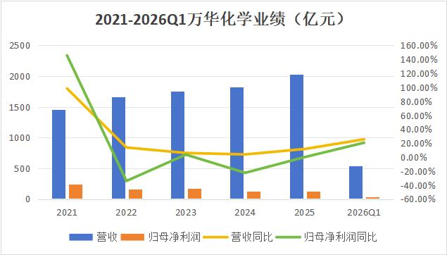 虽然2025年的业绩不是特别“亮”,但是2026年第一季度,万华化学确实交出了一份漂亮答卷:营收、利润双增,分别同比增长25.5%和20.62%,成为2024年以来首次实现的单季度营收、利润同增。
